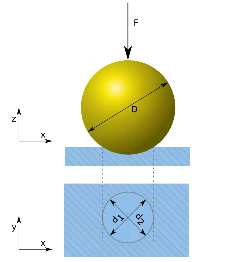 Tipik testte 3,000 kgf (29,42 kN; 6,614 lbf) kuvvete sahip bir girinti olarak 10 mm (0,39 inç) çapında bir çelik bilye kullanılır. Daha yumuşak malzemeler için daha küçük bir kuvvet kullanılır; daha sert malzemeler için, çelik bilye yerine bir tungsten karbür bilyesi kullanılır. Girinti ölçülür ve sertlik şu şekilde hesaplanır:
