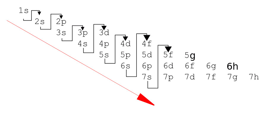 1s, 2s, 2p, 3s, 3p, 4s, 3d, 4p, 5s, 4d, 5p, 6s, 4f, 5d, 6p, 7s, 5f, 6d, 7p, (8s, 5g, 6f, 7d, 8p ve 9s)