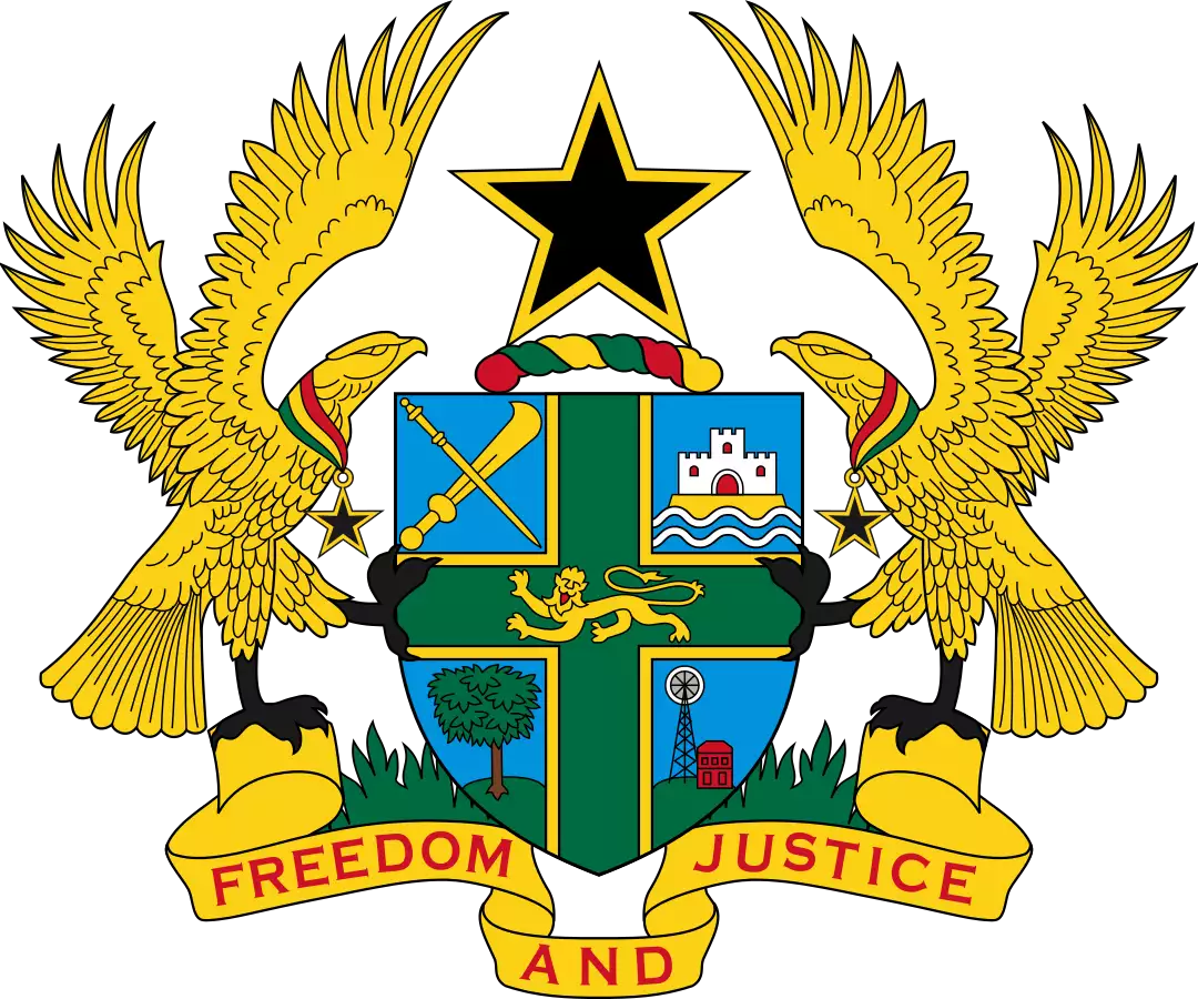 Arması iki hayvanı betimliyor: sarımsı kartal (Gana'nın karasularının %35'i çöl, %35'i orman, %30'u savan) ve aslan (Panthera) leo, büyük bir kedi); tören kılıcı, hanedan denizi üzerinde bir kale, bir kakao ağacı ve Gana'nın endüstriyel maden zenginliğini temsil eden bir maden ocağı ve Gana'nın mineral altın servetini ve Gana'lı lodestarı temsil eden altın renkli beş köşeli siyah bir yıldız. Aynı zamanda Özgürlük ve Adalet efsanesi vardır.