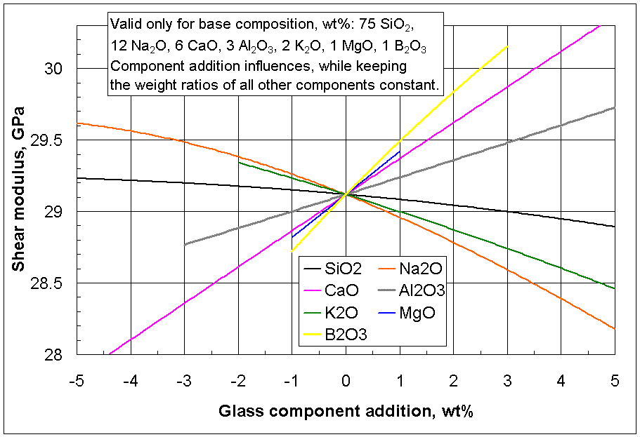 Seçilen cam bileşen ilavelerinin belirli bir temel camın kayma modülü üzerindeki etkileri. |