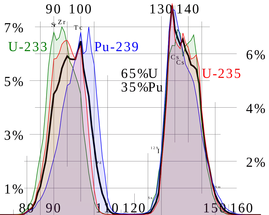 Fisyon ürünü kütle olarak uranyum-235, plütonyum-239, mevcut nükleer güç reaktörlerinin iki tipik kombinasyonu ve toryum döngüsünde kullanılan uranyum-233'ün termal nötron fisyonu için verir. |
