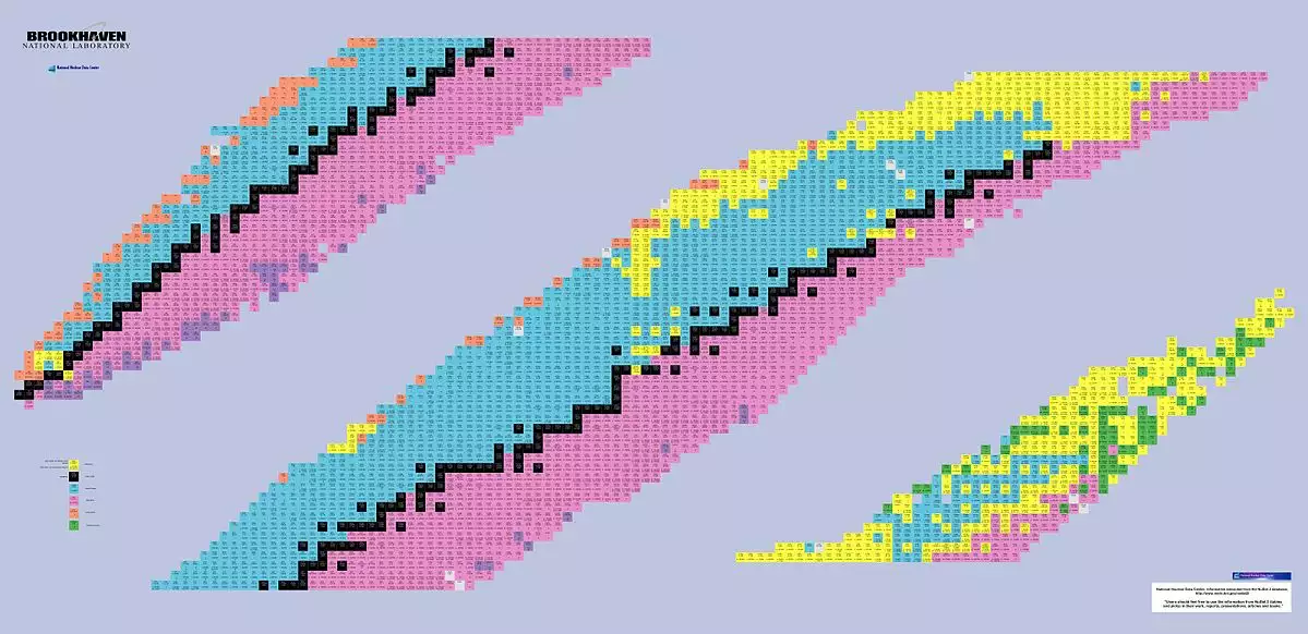 Bir nüklid şeması. Yukarıda, daha iyi sunum için üç parçaya bölünmüş; aşağıda, kombinedir. |