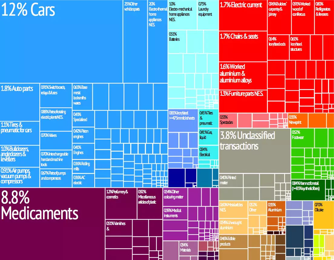 28 renk kodlu kategoride Slovenya'nın ürün ihracatının grafiksel bir tasviri. |