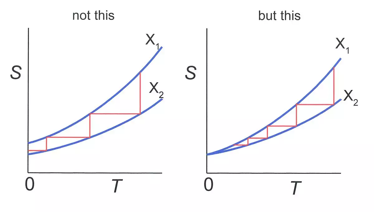 Şekil 1 Sol taraf: S(0,X1)≠S(0, X2) ise mutlak sıfıra sonlu adımlarla ulaşılabilir. Sağ: S(0,X1)= S(0,X2) olduğundan sonsuz sayıda adım gereklidir. |